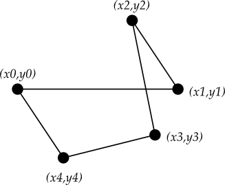 As displayed, a polygon has two parts: its outline and its interior. Its geometry is specified as a series of vertices [(x0, y0), (x1, y1), … (xn, yn)], but the actual perimeter includes one more segment from (xn, yn) back to (x0, y0). In this example, there are five vertices: