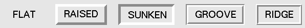 The relief style of a widget refers to certain simulated 3-D effects around the outside of the widget. Here is a screen shot of a row of buttons exhibiting all the possible relief styles: