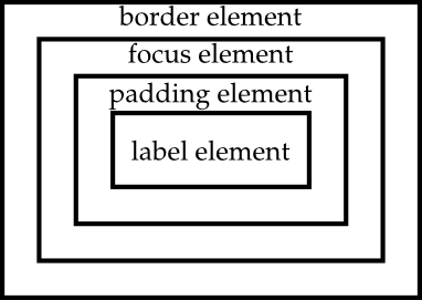 Each style is composed of one or more elements. For example, the style of a typical button has four elements: a border around the outside; a focus element that changes color when the widget has input focus; a padding element; and the button's label (text, image, or both).